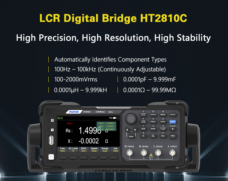 February 26, 2026: Hantek officially launches the all-new HT2810C desktop digital bridge! The HT2810C automatically identifies component types; features continuously adjustable test frequencies from 100Hz to 100kHz; continuously adjustable test levels from (100-2000)mVrms; Internal DC bias voltage (0-1500)mV continuously adjustable; Supports DC resistance and electrolytic capacitance measurement; Basic accuracy 0.1%; Supports open-circuit and short-circuit calibration; Data hold and data logging functions; Standard configuration: USB HOST, USB DEVICE, LAN, RS232/485, Handler; Supports SCPI communication protocol; Handler interface supports comparator sorting.